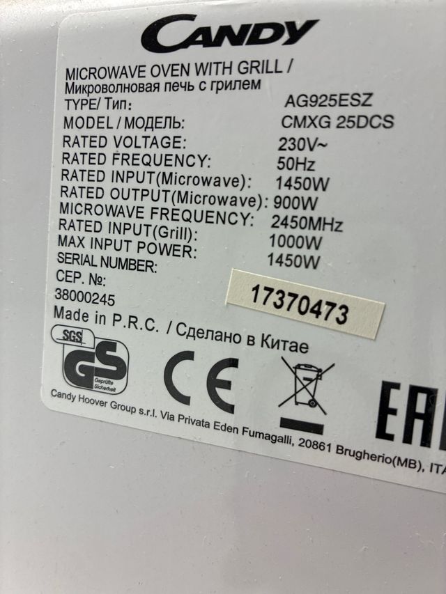 Detalles del productoMicroondas Candy con función grill, modelo AG925ESZ CMXG 25DCS.