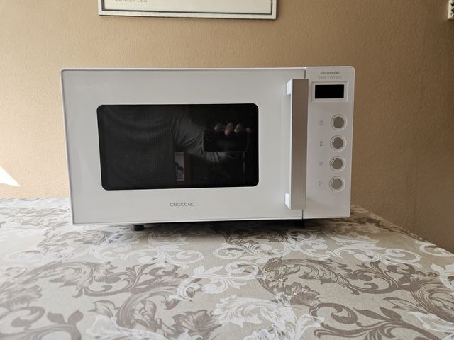 Microondas Cecotec Grandheat 2000 Flatbed en color blanco con tacos de apoyo.