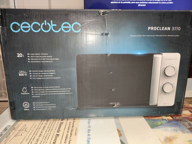 Detalles del productoMicroondas Cecotec ProClean 3110 totalmente nuevo, precintado, a estrenar, es de color plata y tiene una capacidad de 20 litros, ncluye grill de 800W, fácil de limpiar, grill con resistencias halógenas, más productos en mi perfil, cualquier duda hablar por wallapop o por WhatsApp al 633029965.