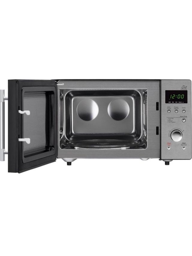 Microondas de acero inoxidable con puerta abatible. - Interior espacioso. - Panel de control digital. - Asa plateada. incluye grill y opciones de combi