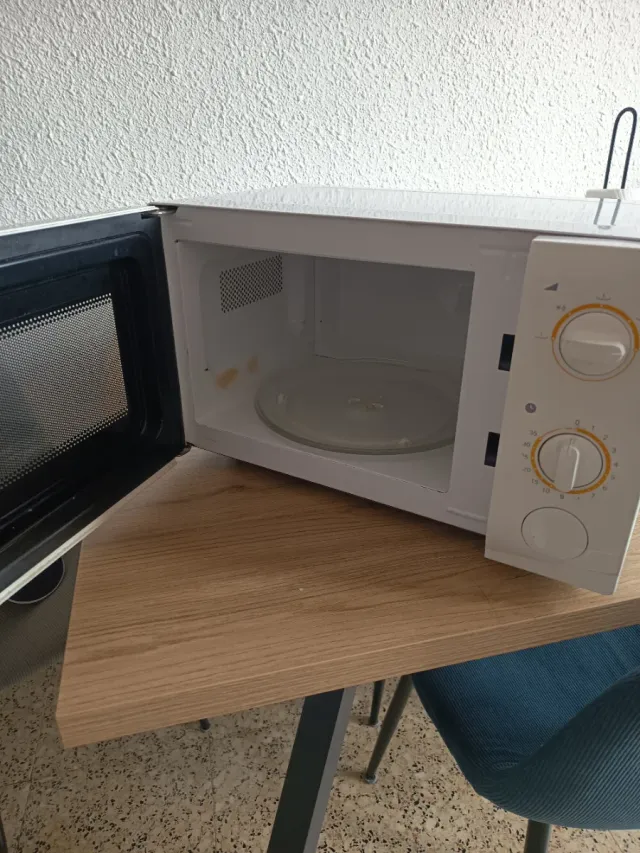 Microondas de la marca DSRWO en color blanco. Ideal para calentar y cocinar. - Puerta abatible. - Panel de control con mandos giratorios. - Plato interior giratorio.