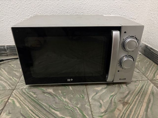 Detalles del productoMicroondas plateado con función grill. Cuenta con dos mandos giratorios para ajustar el tiempo y la potencia.