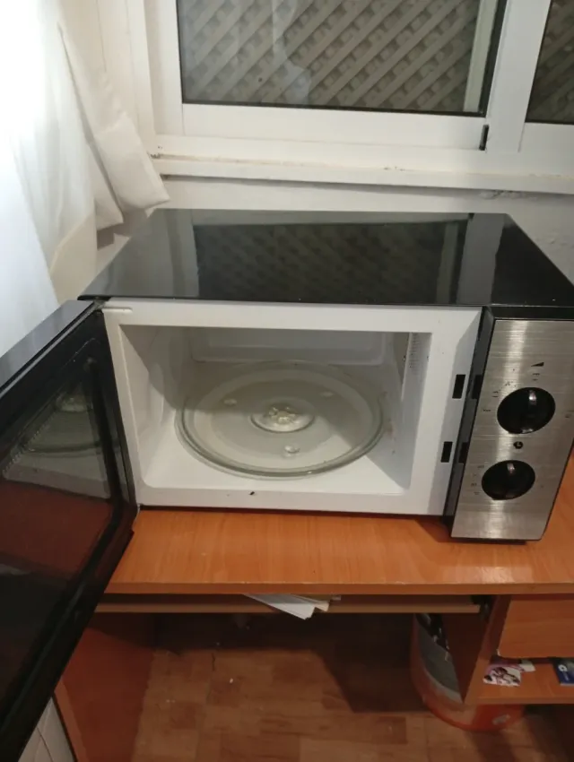 Microondas de color gris con puerta de cristal. - Interior espacioso. - Plato giratorio de cristal. - Panel de control con botones y diales.