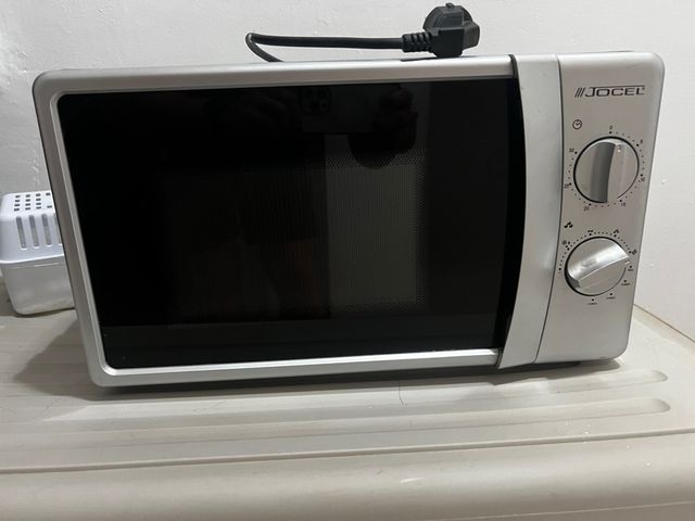 Microondas Jocel en color plateado. Ideal para calentar y cocinar alimentos. - Diseño moderno y compacto. - Panel de control con dos mandos giratorios.