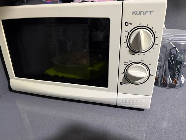 Microondas de la marca KUNFT en color blanco. Cuenta con dos mandos giratorios para ajustar el tiempo y la potencia.