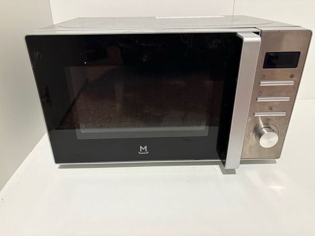 Detalles del productoMicroondas de la marca MANDINE en color plateado y negro. Cuenta con un panel de control digital y un mando giratorio.