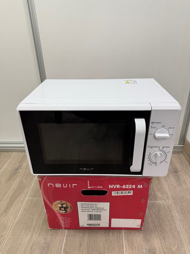 Detalles del productoMicroondas blanco de la marca Nevir, modelo NVR-6224 M. Tiene una capacidad de 20 litros.