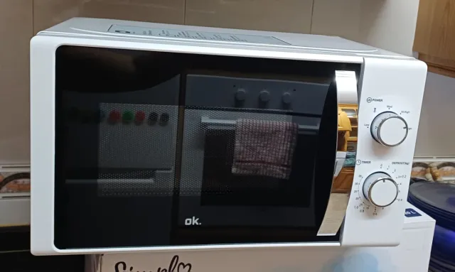 Detalles del productoMicroondas de la marca Ok en color blanco. Un electrodoméstico práctico para tu cocina.