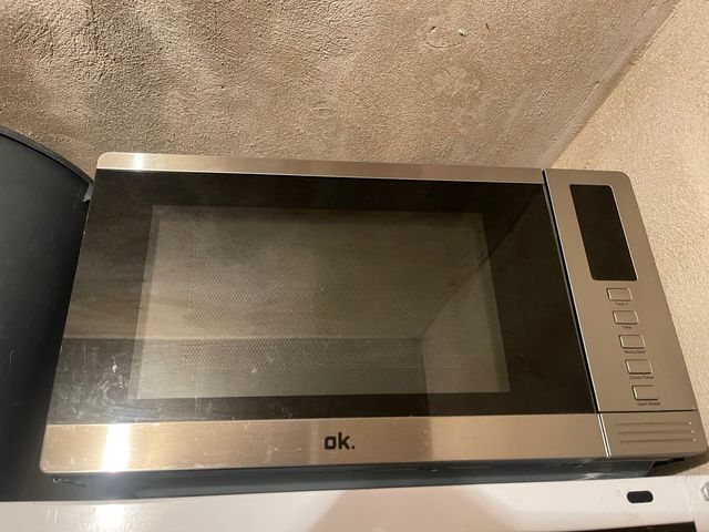 Microondas de la marca OK con acabado en plateado. - Diseño moderno y elegante. - Panel de control intuitivo.