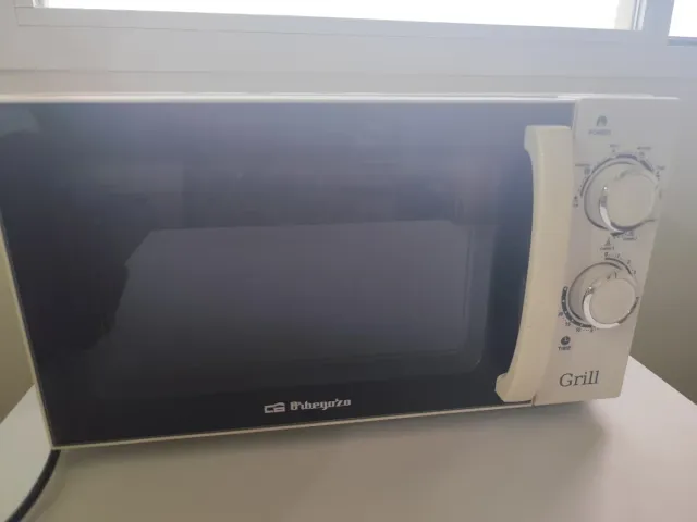 Microondas de color blanco con función grill. - Panel de control con dos mandos giratorios. - Puerta con cristal tintado. - Marca: Orbegozo.