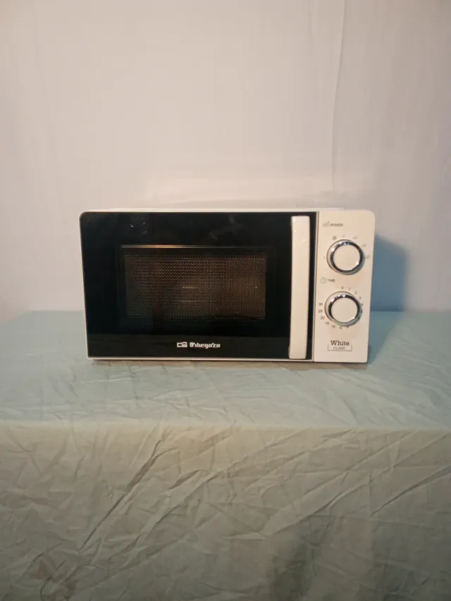 Microondas de la marca Orbegozo en color blanco. Cuenta con dos mandos giratorios para ajustar la potencia y el tiempo.