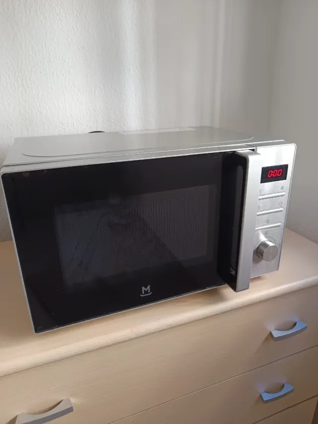 Detalles del productoMicroondas de color plateado con un diseño moderno y panel de control digital.