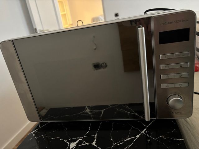 Detalles del productoMicroondas plateado con acabado en acero inoxidable.