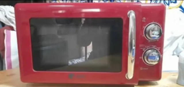Detalles del productoMicroondas de color rojo con un diseño retro y elegante. Cuenta con un asa plateada y dos mandos giratorios para ajustar la potencia y el tiempo.