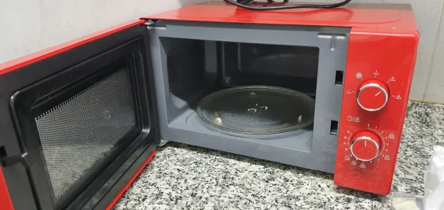 Detalles del productoMicroondas de color rojo con puerta abatible y plato giratorio.