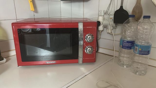 Detalles del productoMicroondas de color rojo con un diseño retro.
