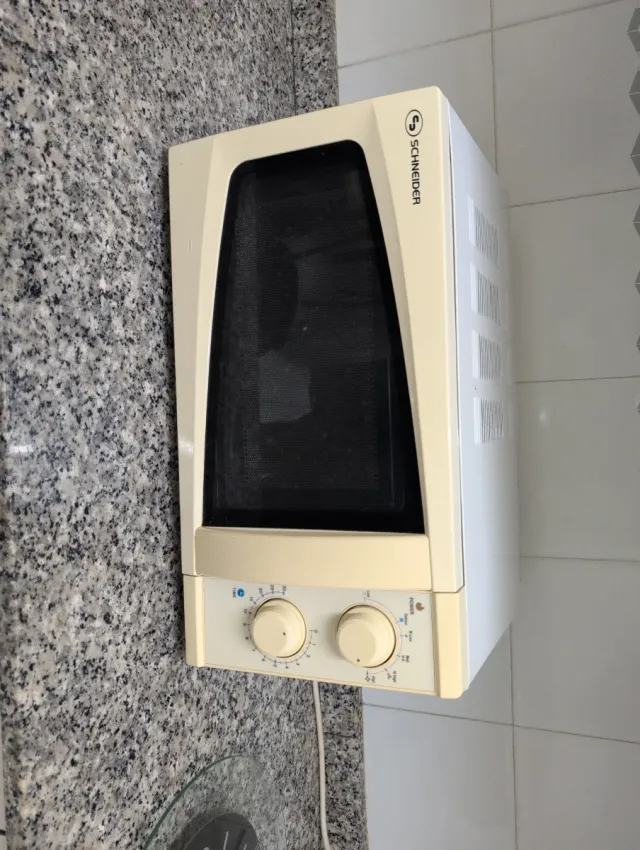 Detalles del productoMicroondas de la marca Schneider en color blanco y beige.