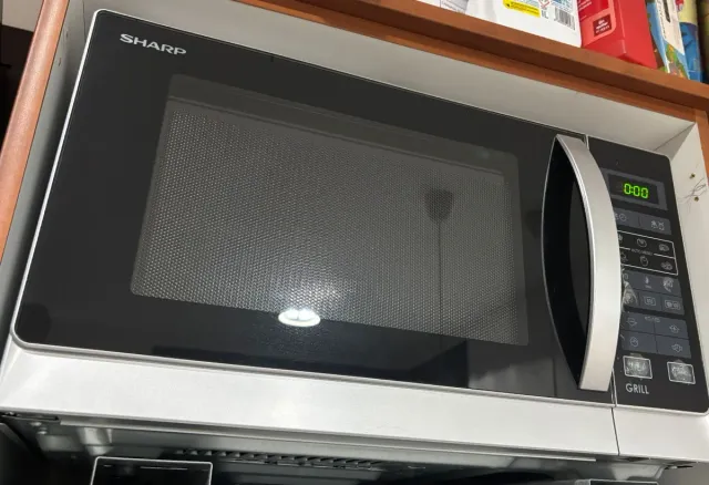 Detalles del productoMicroondas de la marca Sharp en color plateado y negro.
