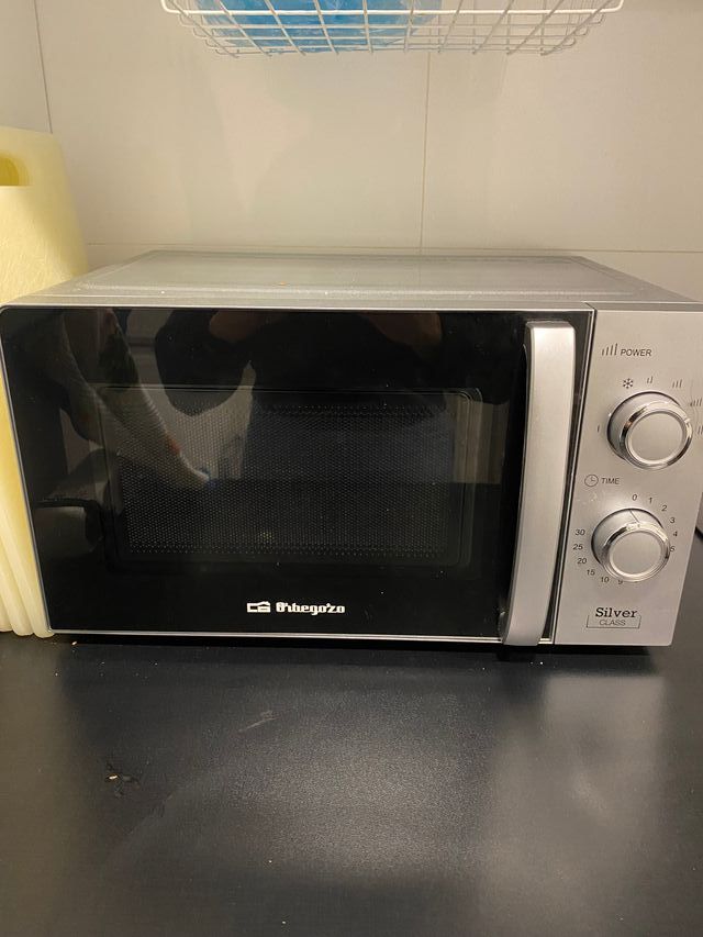 Microondas plateado de la marca Begoza. Diseño moderno y compacto. - Acabado en color plateado. - Panel de control con botones y diales. - Puerta con ventana. - Asa plateada.