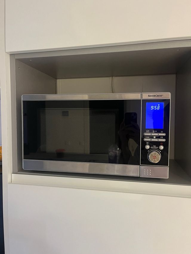 Detalles del productoMicroondas SilverCrest de 30L en color negro y plateado. Diseño moderno y elegante. Funciona perfectamente pero está un poco despellejado por dentro la parte del plato como se aprecia en las fotos. El precio es negociable. Puerta con acabado espejo y panel de control digital Medidas del producto