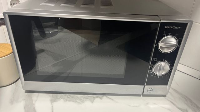 Detalles del productoMicroondas Silvercrest en color plateado y negro. Cuenta con dos mandos giratorios para ajustar la potencia y el tiempo.
