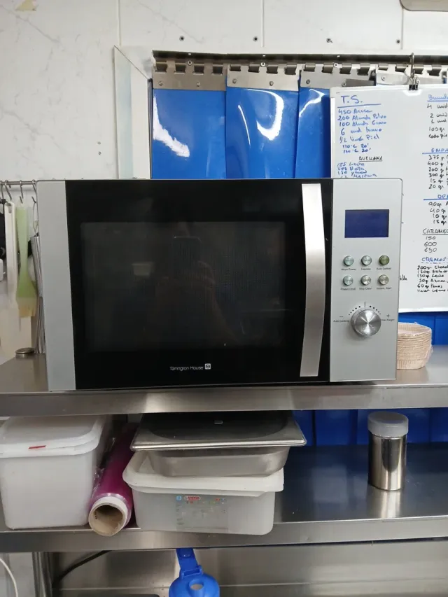 Microondas de sobremesa con panel de control digital y selector giratorio. - Marca: T.S. - Panel digital con botones. - Selector giratorio para ajustes.