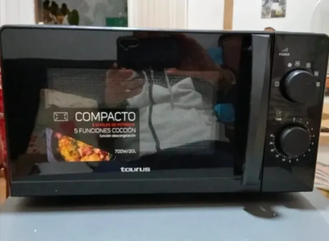 Microondas Taurus en color negro, modelo Compacto. - 5 niveles de potencia. - Función de descongelación. - Capacidad de 20L. - Potencia de 700W.