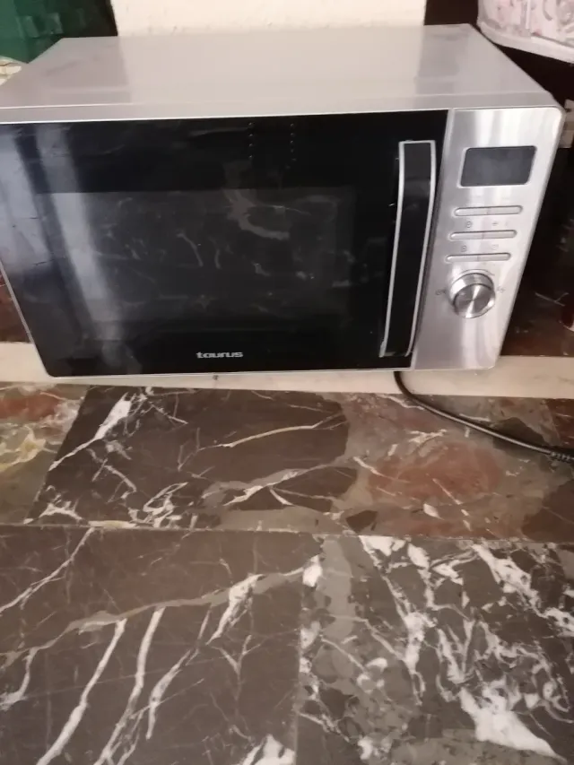 Detalles del productoMicroondas Taurus en acabado plateado, con puerta de cristal negro y panel de control.