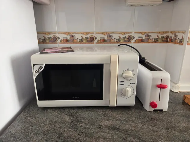Conjunto de electrodomésticos de cocina en color blanco. - Microondas con función grill. - Tostadora con ranuras para pan.