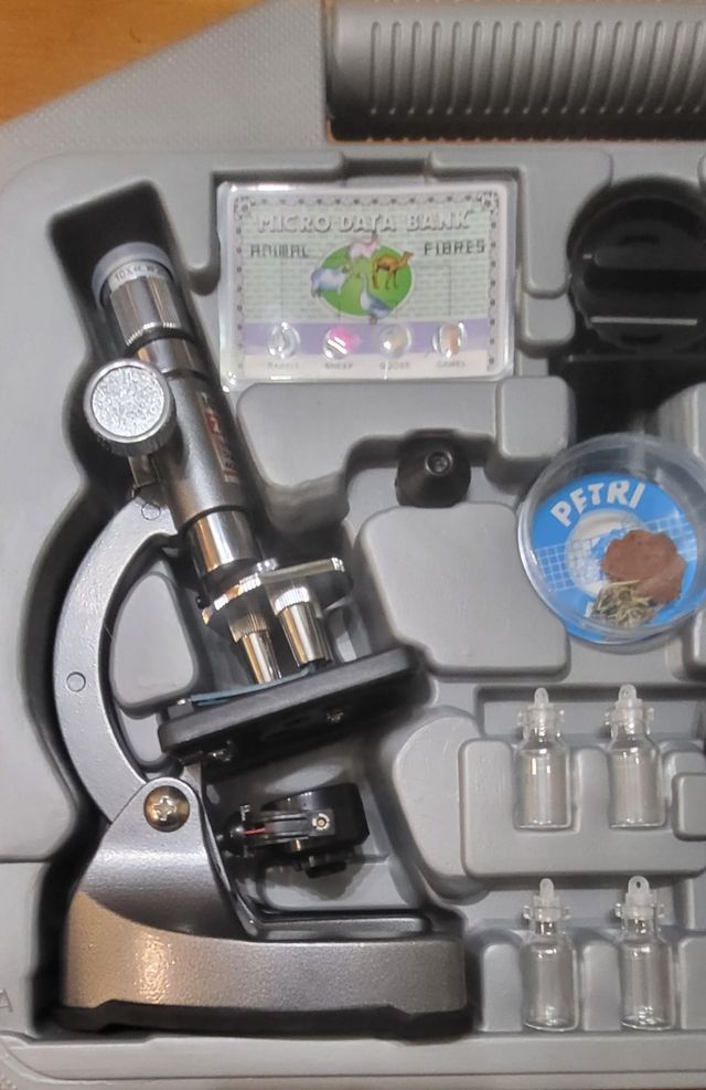 Detalles del productoMicroscopio de óptica de precisión con aumentos de 10x a 1200x. Incluidos accesorios para iniciarse en la observación. +10 años. Incluye luz. Bombilla funcionando. Base metálica, muchos accesorios. No incluidas las pilas.