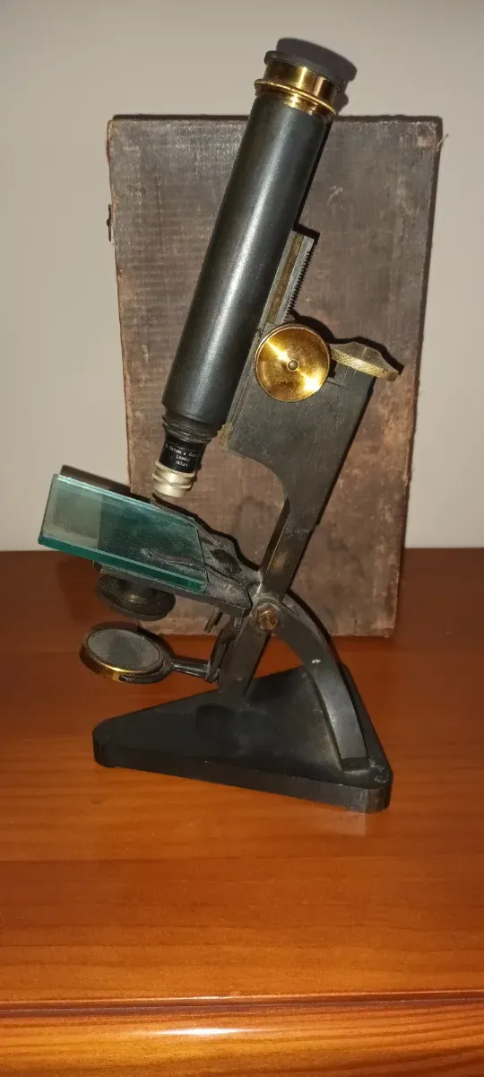 Microscopio antiguo con su caja de madera original. Un objeto clásico para coleccionistas o amantes de la ciencia. - Cuerpo principal de metal oscuro. - Detalles en laton