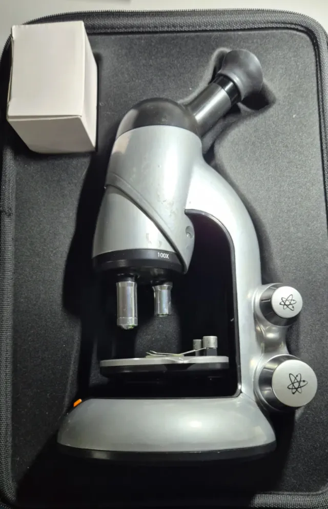 Detalles del productoMicroscopio educativo plateado con zoom de 40x a 400x. Incluye accesorios y maletín, para empezar a explorar.