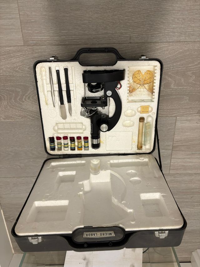 Detalles del productoMicroscopio educativo con su maletín original y todos los accesorios incluidos: portaobjetos, pinzas, bisturí, tubos de muestra y material de observación.