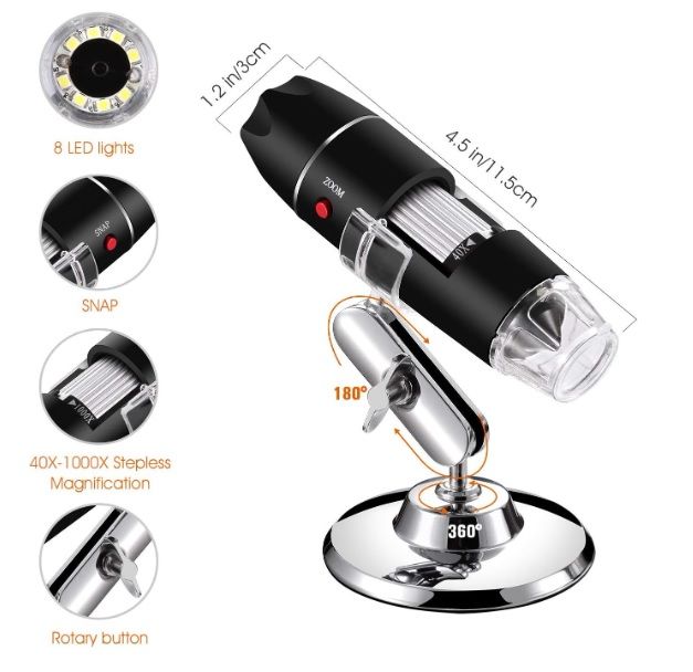 Detalles del productoMicroscopio digital USB. Microscopio profesional le permite acercar y alejar para ver detalles increíbles en un rango de aumento de 40-1000X. Tiene 8 luces LEDs para ajustar la iluminacion. Vista desde ordenador o telefono movil con imagen a tiempo real para realizar fotos y videos. Compatible con Android, Windows Linux y MacOS. Se puede usar como camara endoscopio. Incluye microscopio y accesorios. Realizamos envios por Wallapop y envios contrareembolso. Producto nuevo con 2 años de garantia.
