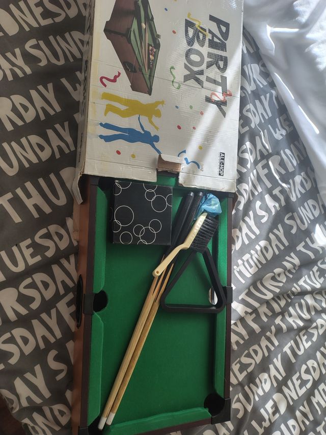 Mini mesa de billar de la marca Alehop, ideal para partidas divertidas. - Incluye tacos, bolas, triángulo y cepillo.