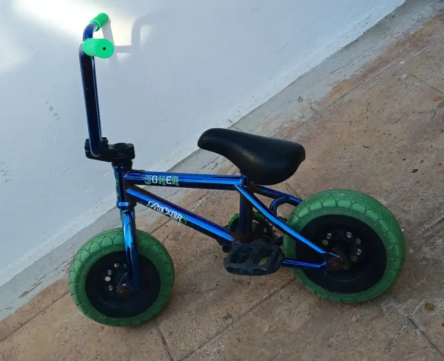 Detalles del productoMini BMX de color azul brillante con detalles llamativos y ruedas verdes. Usada muy poco.