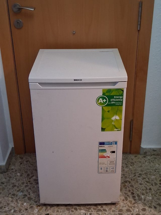 Detalles del productoSe vende mini congelador Beko en buen estado. Es de color blanco y tiene una eficiencia energética A+. - Capacidad de 177 litros. - Medidas compactas, ideal para espacios pequeños. - Incluye pegatina de eficiencia energética.