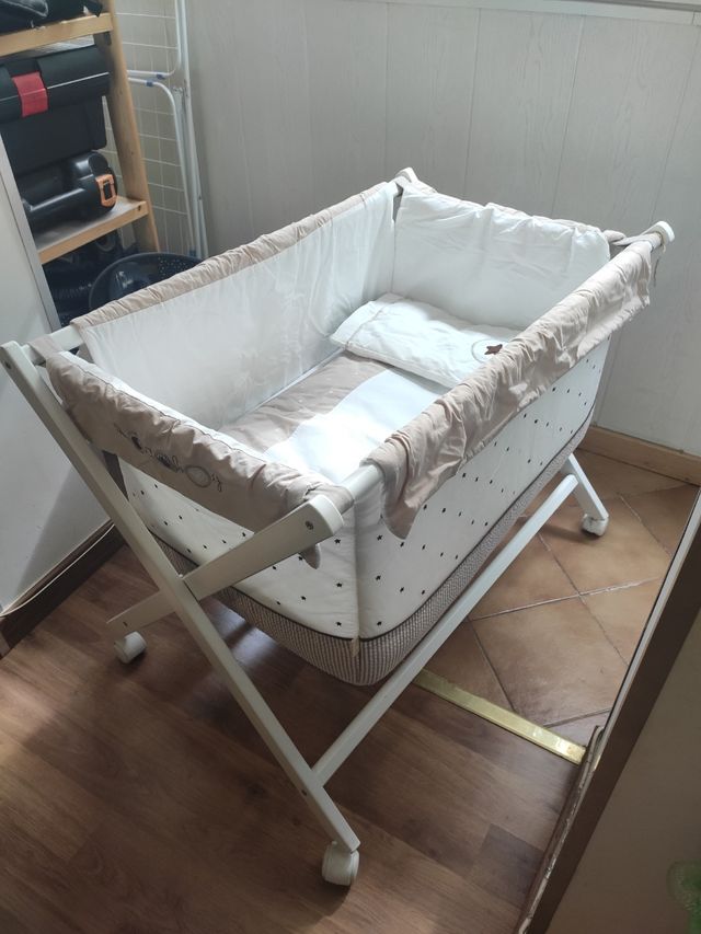 Mini cuna plegable con ruedas. Incluye colchón, protector del colchón, dos edredones con funda y 4 sábanas bajeras.