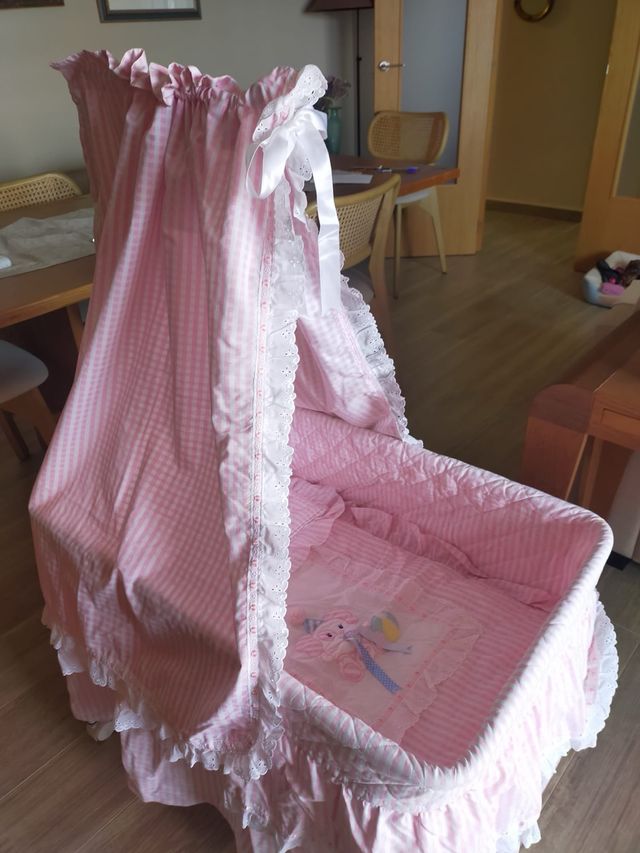 Detalles del productoMini cuna (84x54) con un encantador diseño a cuadros en rosa y blanco, ideal para los más pequeños. Cuenta con un dosel (desmontable) decorado con volantes y encaje. No envíos solo recogida