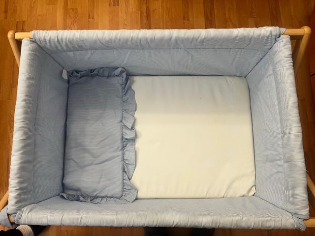 Mini cuna con un diseño de rayas azules y blancas. Incluye un colchón y una funda. - Estructura de madera. - Funda de tela con rayas azules. - Colchón incluido.