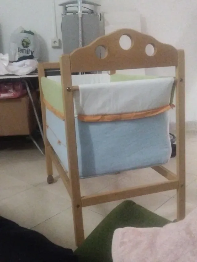 Detalles del productoMini cuna de madera con laterales de tela. Medida 55x87x74