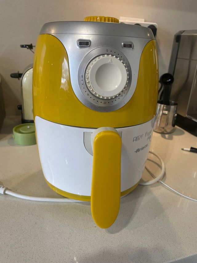 Detalles del productoFreidora de aire compacta en color amarillo y blanco.