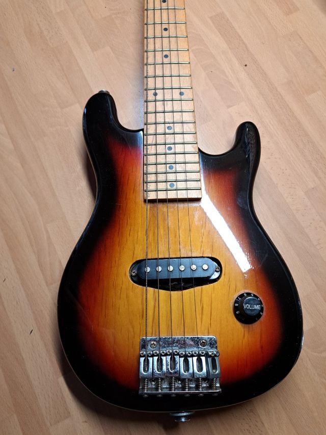 Detalles del productoMini guitarra eléctrica con acabado sunburst.