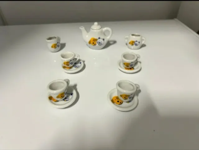 Adorable mini juego de té de cerámica, perfecto para coleccionar o jugar. - Incluye tetera, tazas y platillos. - Diseño con ositos. - Ideal para casas de muñecas.