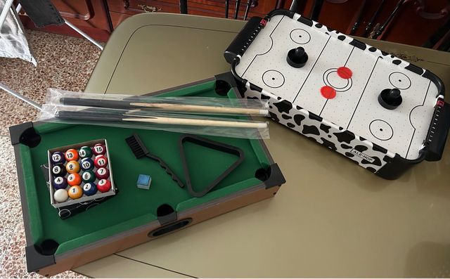 Set de juegos de mesa para diversión. - Mini mesa de billar con bolas, taco... 10€ - Mini mesa de hockey de aire con discos y mazos 10€ - Se venden sin caja (Se vende por separado)