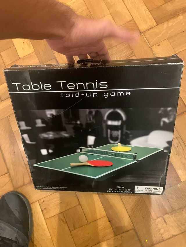 Detalles del productoCompacta mesa de ping pong plegable, ideal para jugar en cualquier lugar. Incluye red, palas y pelotas.