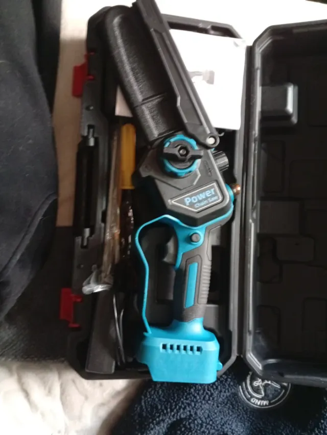 Detalles del productoMini motosierra eléctrica inalámbrica, ideal para trabajos de jardinería y poda.