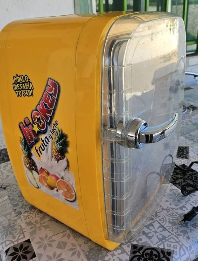 Detalles del productoMini nevera de color amarillo con una capacidad de 10 litros. Ideal para mantener tus bebidas frías. Para casa y coche.