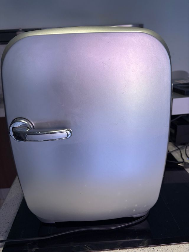 Mini nevera de 42x30 cm, completamente nueva a estrenar. - Color plateado iridiscente. - Diseño retro con tirador cromado.