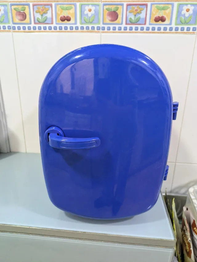 Mini nevera de color azul, ideal para mantener tus bebidas o snacks frescos. Color: Azul Nevera enchufable con cable para corriente y para coche.